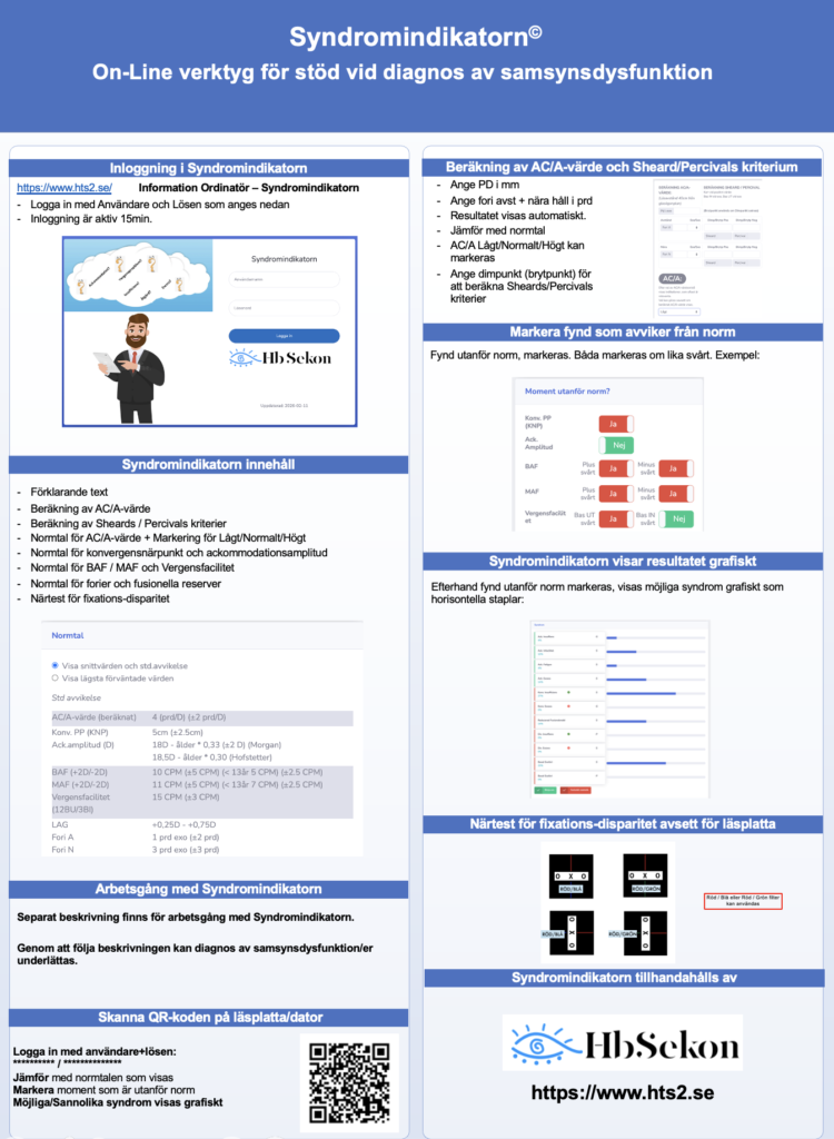Ordinatörer av HTS2 har tillgång till On-Line verktyget Syndromindikatorn, som kan användas som stöd vid diagnos. I verktyget finns även ett test för fixations-disparitet som kan användas på valfritt näravstånd. Testet används tillsammans meds Röd/Blå eller Röd/Gröna filter.